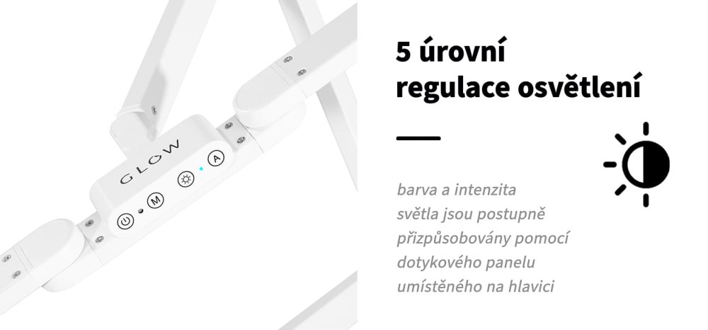 Plynulé Nastavenie: Dotykový panel na hlave lampy umožňuje plynulé aj postupné (5 úrovní) nastavenie teploty farieb (od teplej po studenú - 3000 – 6500 K) a intenzity svetla (1400 – 1540 LM).